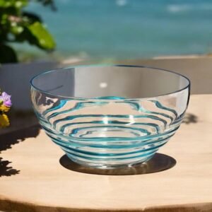Elevate your dining table indoors or out with this 10-inch clear and blue swirl acrylic round salad bowl, perfect for serving fresh salads in a casual style. Crafted from food-safe acrylic, this bowl boasts a unique swirl design in clear and blue hues that adds a touch of elegance to your table setting. The round shape of the bowl offers ample space for tossing and serving your favorite salads, making it a practical yet stylish addition to your serve ware collection. 4.9-inch H x 10-inch W x 10-inch D