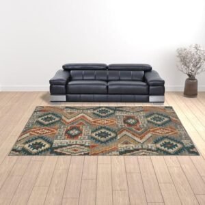 Add some artistry to your room with this 10′ x 13′ blue teal grey orange gold ivory and rust geometric power loom stain resistant area rug. This rectangle shaped rug features a geometric design in blue teal grey orange gold ivory and rust to give it visual interest. A classic shape marries with good looking design for your space Ideal for spaces with kids and pets, this rug is stain resistant to help repel stains and spilled liquids. Area Rugs help to give warmth and sense of home to your space. 0.39″ H x 118.11″ W x 153.54″ DIngredients: Size: Color: Made In: United States