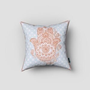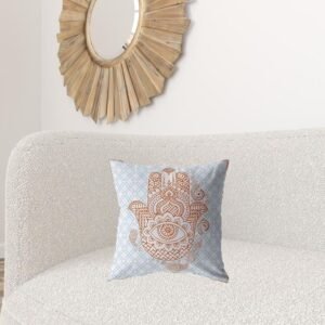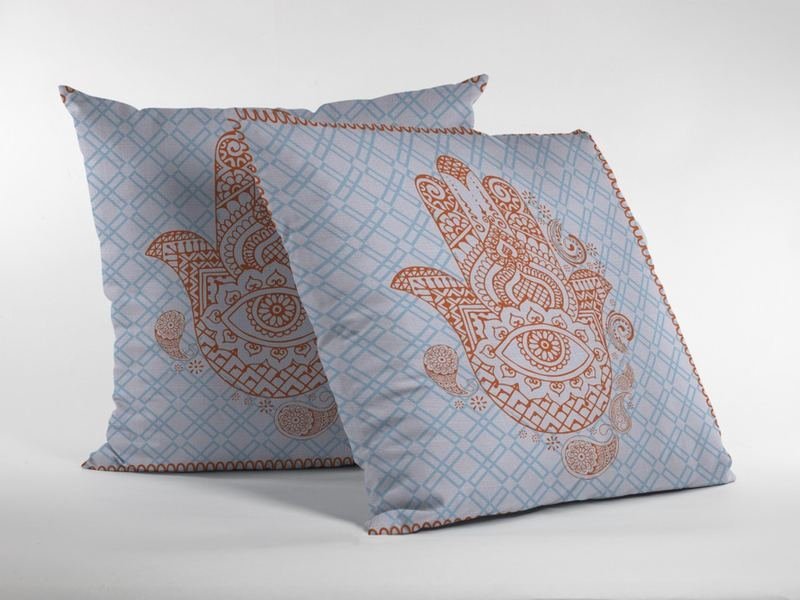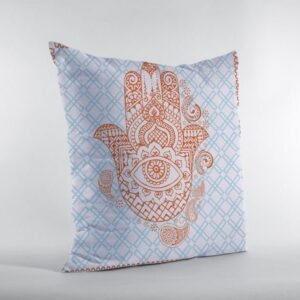 Impart a peaceful vibe into your room with this precisely designed Blue Orange Hamsa Suede Zippered Throw Pillow on the couch, sofa or bed. The enticing display of the very traditional hamsa hand design with muted orange on a white and sky blue geo pattern base looks much promising in its boho-chic style.This decorative pillow is made from premium quality leather-like suede fabric for enhanced durability and utmost softness, making it a plush accent piece for your home. It comes with a soft polyfill insert for added fluffiness that provides utmost comfort to your back and neck while the zippered closure makes the cover easy to take off for washing. This decorative pillow stands out in class and coziness, providing a tranquil ambiance into your bohemian space. 18?EUR? x 18?EUR? x 5?EUR?