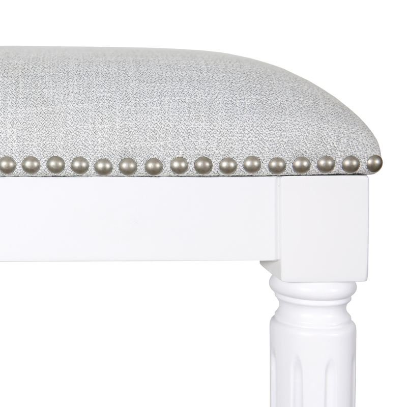 Bring a trendy bar vibe to your space, with this 27-inch gray and antiqued white solid wood backless counter height bar chair. The gray upholstered seat of this stool is a nice contrast to the high quality, antiqued white solid wood of the base. A backless mixed with a square shaped seat makes this chair both comfortable and fashionable. Designed with a footrest for comfort and convenience. 25.75-inch H x 16-inch W x 16-inch D