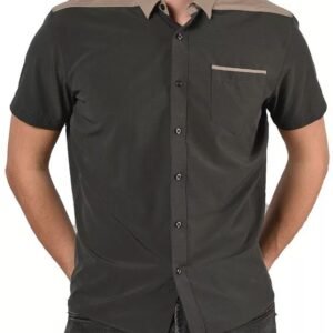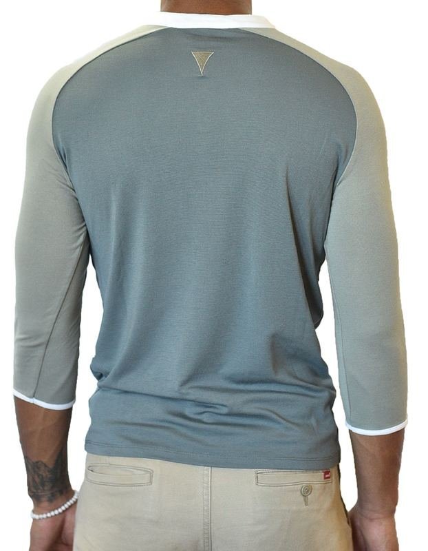 Step-up your day or evening in this stylish, breathable 3/4 sleeve henley shirt in dark gray with taupe sleeves, white collar and sleeve ends. This high quality shirt combines comfort with long lasting durability and is made with super soft, stretch, and quick dry fabric for a superior look and feel. The fabric is wrinkle resistant so the shirt comes out of the dryer ready to wear. Make your point in style!