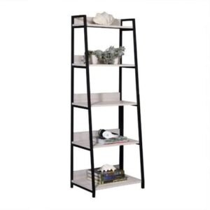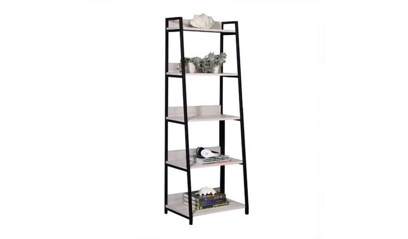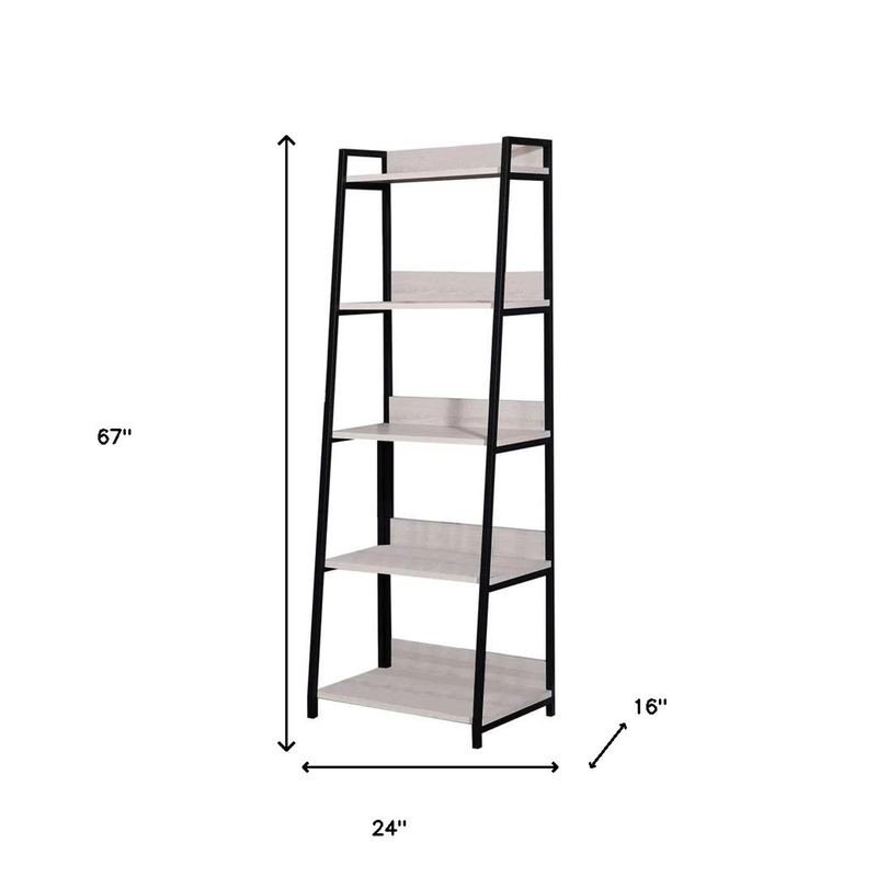 The 67-inch natural and black metal five tier ladder bookcase offers you storage and display space in a good looking and refined manor. 5 shelf tiers are available, providing great storage and display options for everything from books and photos to decorations. Great to use independently or pair with additional units to create a different look and add even more storage. Carefully crafted to fit in tight spaces, you can turn almost any nook into a stunning display showcase for books, plants decor and more. 67-inch H x 24-inch W x 16-inch DIngredients: Size: Color: Made In: Taiwan