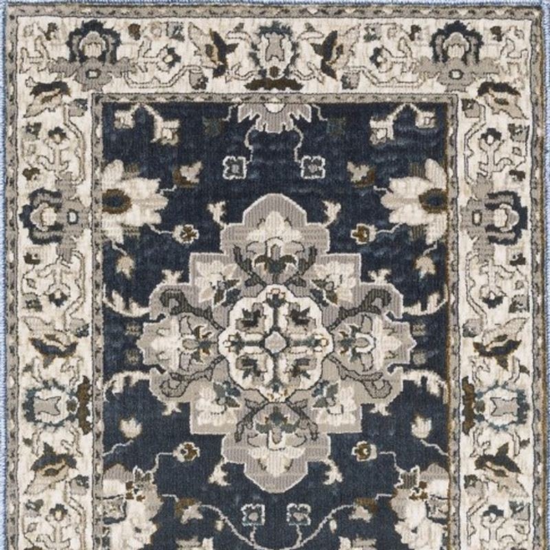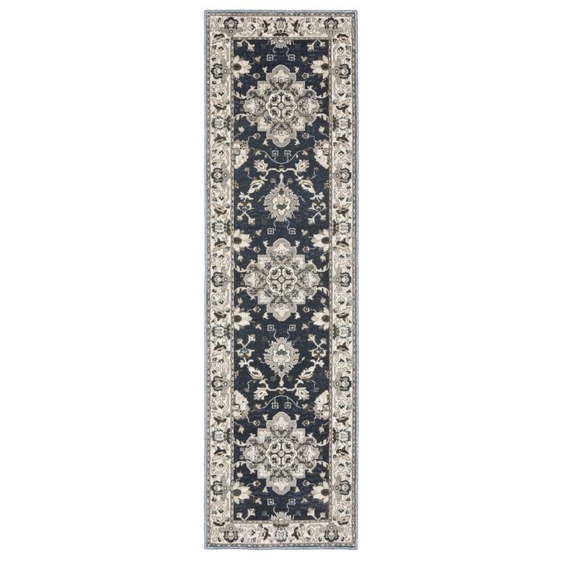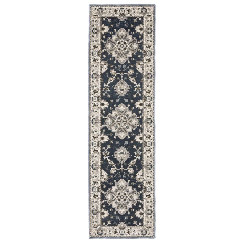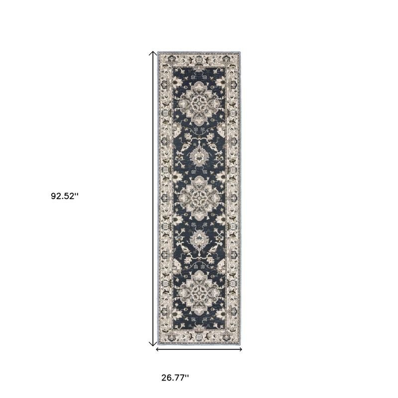 Set an inviting tone in your space with this 8-foot blue oriental power loom runner rug. This runner shaped rug features a oriental design in blue to give it visual interest. A classic shape marries with good looking design for your space ideal for spaces with kids and pets, this rug is stain resistant to help repel stains and spilled liquids. Place this area rug against a hardwood or tile floor and it will enliven your living space with style and sophistication. 26.77-inch H x 92.52-inch W x 0.39-inch D