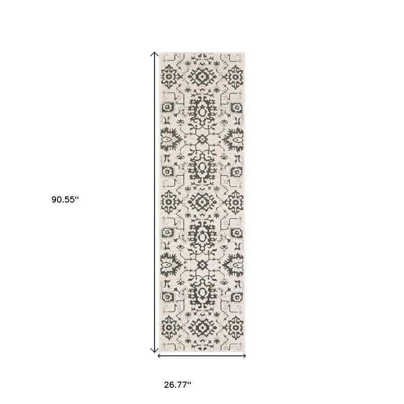 Add some artistry to your room with this 8-foot ivory oriental power loom runner rug. This runner shaped rug features a oriental design in ivory to give it visual interest. A classic shape marries with good looking design for your space the coloring of this rug adds a delightfully neutral tone to your home and will easily match with most any decor. Ideal for spaces with kids and pets, this rug is stain resistant to help repel stains and spilled liquids. Area rugs help to give warmth and sense of home to your space. 26.77-inch H x 90.55-inch W x 0.39-inch D