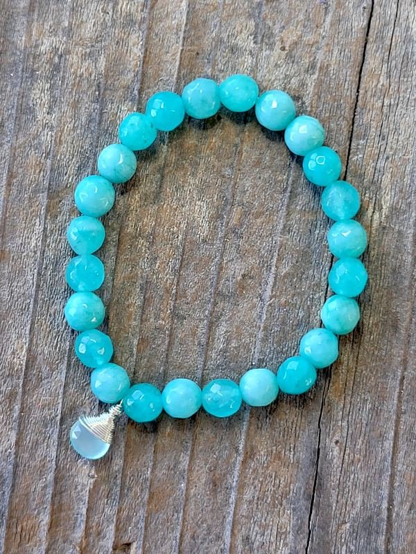 Genuine amazonite beaded stretch bracelet with a hand-wrapped chalcedony stone in silver.