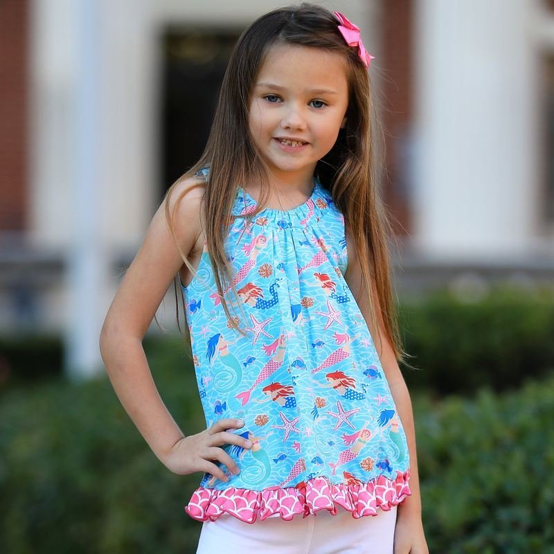 AnnLoren Mermaid swing top Features the sweetest details for a stylish warm weather wardrobe. Ruffles adorn the edge of this open-back swing top for an adorable outfit. Gathered neckline and shoulders. Bow on center of back. The 95% high quality Egyptian cotton and 5% stretchy lycra fabric is SUPER soft and comfortable. Premium dye’s ensure that your outfit won’t fade or run. Machine Washable.