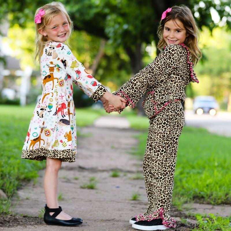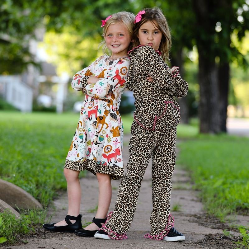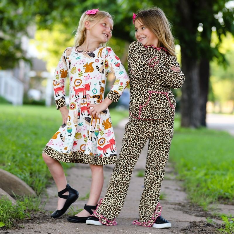 AnnLoren Original Forest Friends and Leopard Dress. Leopard trim on neckline and bottom of dress. The 95% high quality Egyptian cotton/5% Lycra fabric is soft and comfortable. Premium dye’s ensure that your outfit won’t fade or run. Machine Washable.