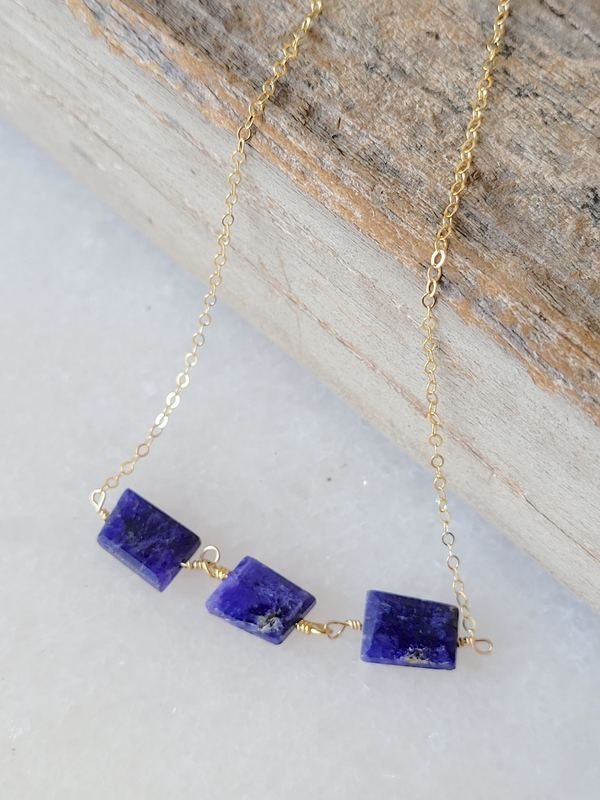 Three Sapphire stones hand-wrapped onto an elegant 14k gold chain.