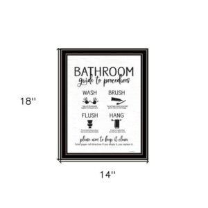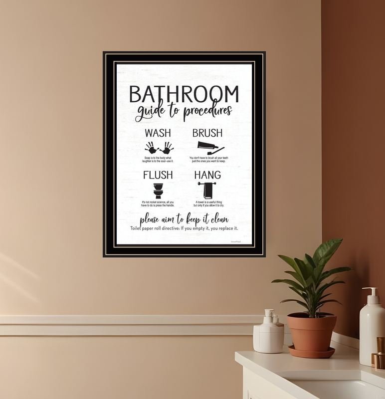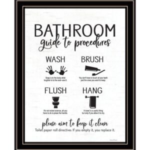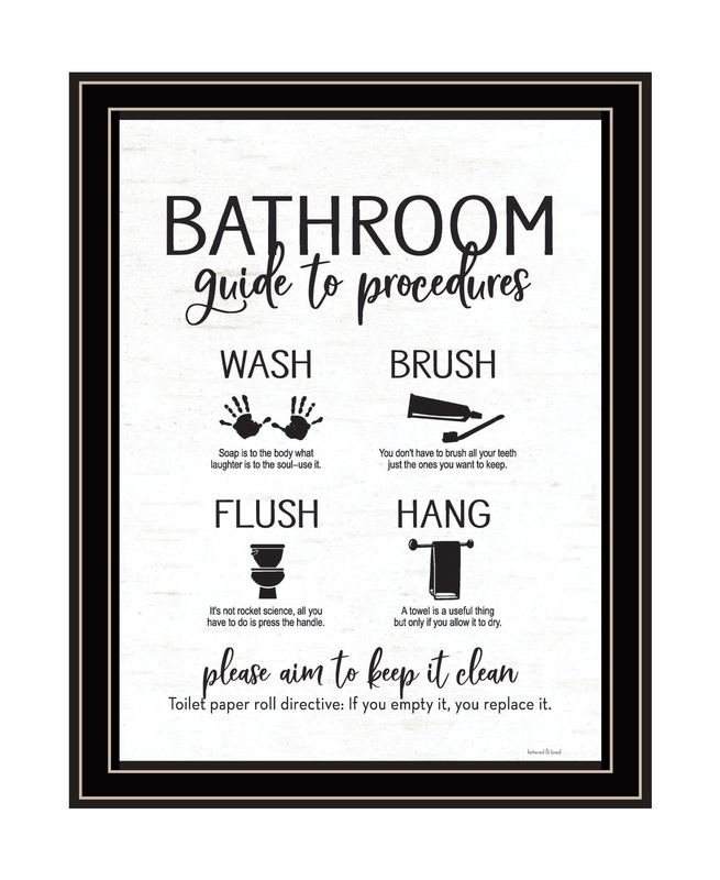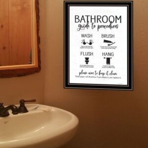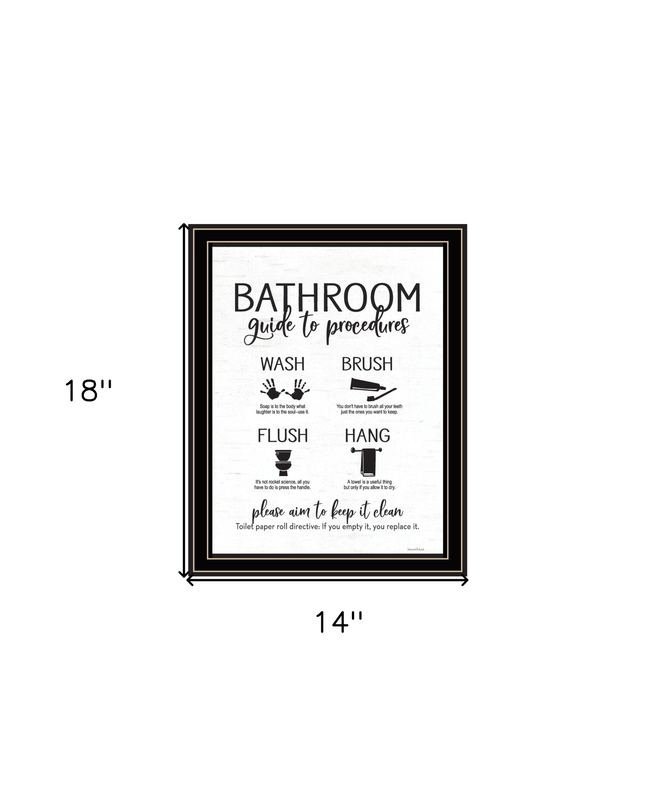 Bring some sizzle to your space with this eye-catching bathroom guide black framed print bathroom wall art. This print is a visual artistic expression that allows you to decorate your space in style. Reproduced for you on wood, this hanging decorative accent will be a trendy and fashionable way to dress your walls in a rustic and modern farmhouse vibe. Hang on your wall to add some up to date fashion and decoration. Instantly liven up your space with this art that brings color and dimension to your walls. 18-inch H x 14-inch W x 1-inch DIngredients: Size: Color: Made In: United States