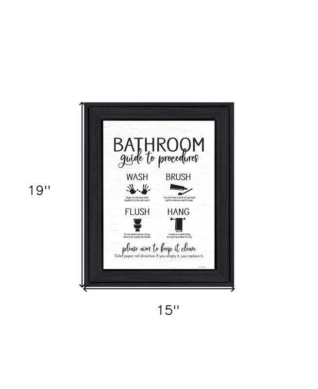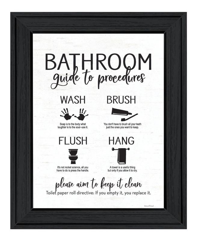 Bring some sizzle to your space with this eye-catching bathroom guide black framed print bathroom wall art. This print is a visual artistic expression that allows you to decorate your space in style. Reproduced for you on wood, this hanging decorative accent will be a trendy and fashionable way to dress your walls in a rustic and modern farmhouse vibe. Adding this hanging wall art to your space to make your room feel more finished and attractive. Utilize this opportunity to create a focal point in the room with this fabulous wall decor option. 19-inch H x 15-inch W x 1-inch D