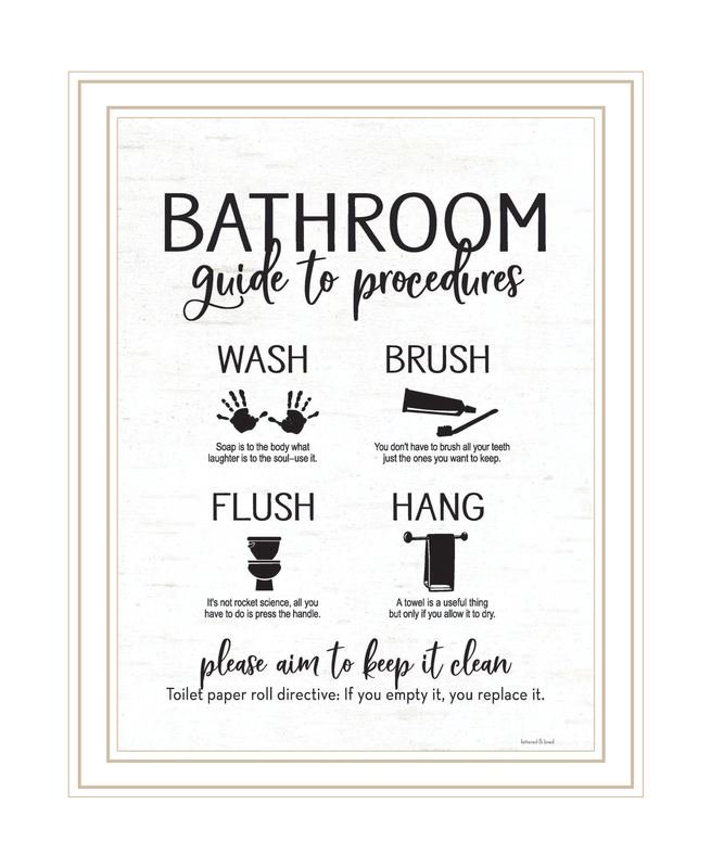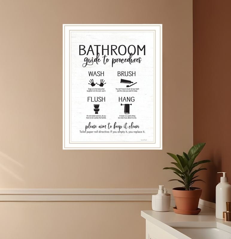 Bring some sizzle to your space with this eye-catching bathroom guide white framed print bathroom wall art. This print is a visual artistic expression that allows you to decorate your space in style. Reproduced for you on wood, this hanging decorative accent will be a trendy and fashionable way to dress your walls in a rustic and modern farmhouse vibe. Hang on your wall to add some up to date fashion and decoration. Utilize this opportunity to create a focal point in the room with this fabulous wall decor option. 18-inch H x 14-inch W x 1-inch D