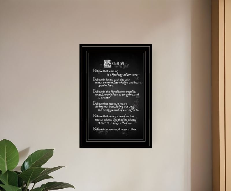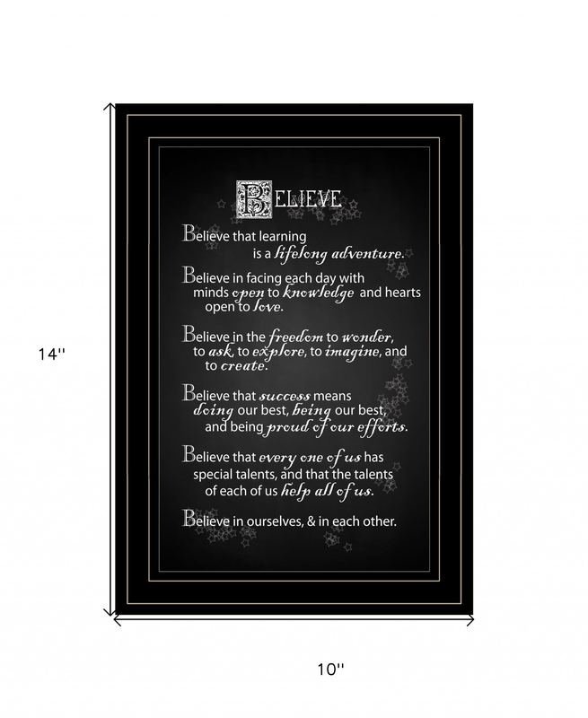 Bring some sizzle to your space with this eye-catching believe 2 black framed print wall art. This print is a visual artistic expression that allows you to decorate your space in style. Reproduced for you on wood, this hanging decorative accent will be a trendy and fashionable way to dress your walls in a rustic and modern farmhouse vibe. Hang on your wall to add some up to date fashion and decoration. Instantly liven up your space with this art that brings color and dimension to your walls. 14-inch H x 10-inch W x 1-inch D
