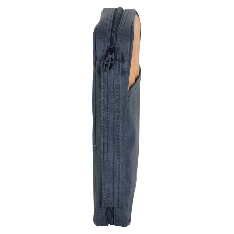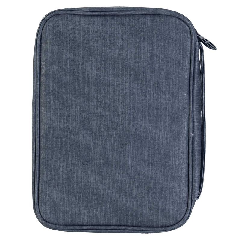 This handsome Bible cover is a textured black, with tan accent above the open front pocket.