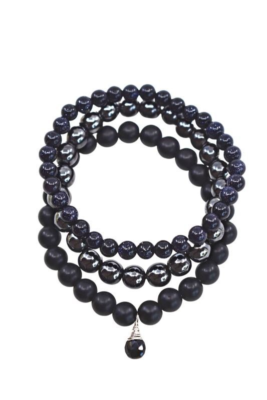 A bracelet set made of three stones including a matte black onyx bracelet, a midnight blue goldstone bracelet, and a hematite stretch bracelet. A wrapped black onyx stone in sterling silver is attached to the onyx bracelet for an added elegance.