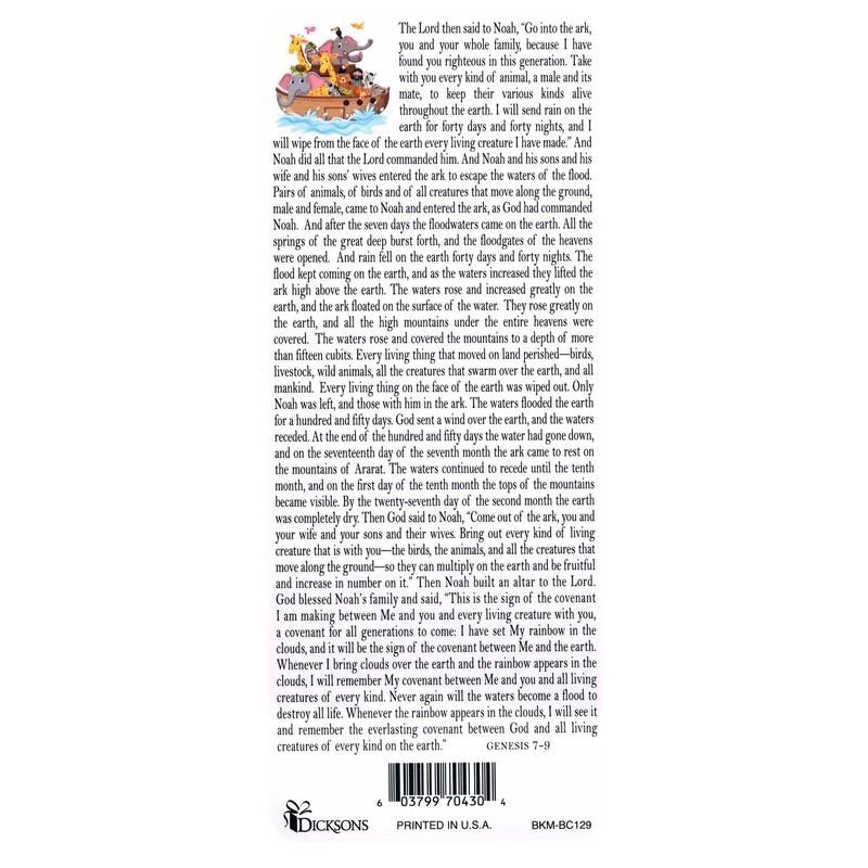 This Bookcard-Sized Bookmark Is 2-5/8 X 6-3/8; Card Stock Is Clear Laminated For Extra Durability. This White Bookmark Features Imagery From The Story Of Noahs Ark In Genesis 6:9-22. Printed In USA.Ingredients: Size: Color: BLU/GRN/BRNMade In: United States