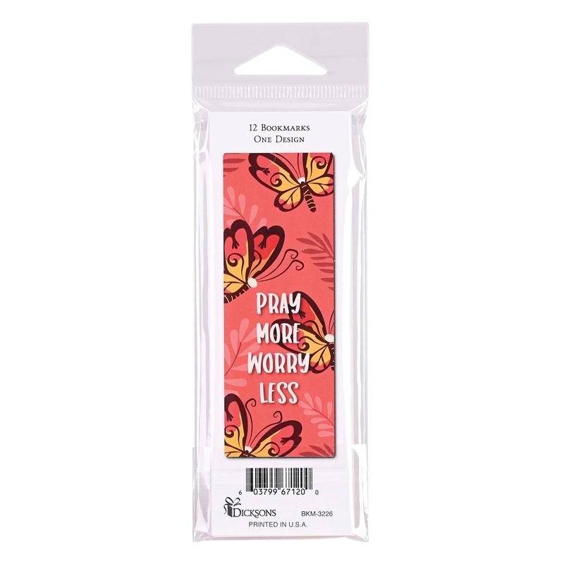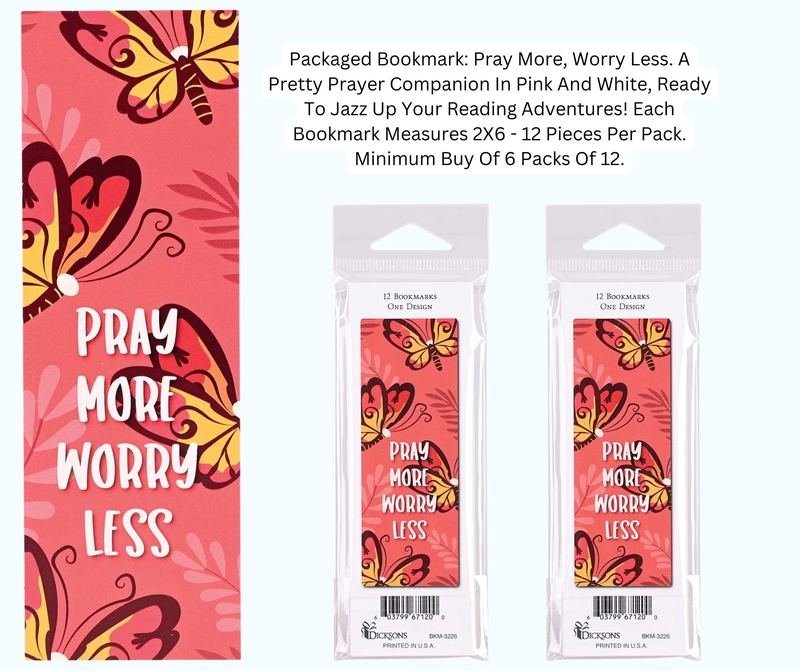 Packaged Bookmark: Pray More, Worry Less. A Pretty Prayer Companion In Pink And White, Ready To Jazz Up Your Reading Adventures! Each Bookmark Measures 2X6 – 12 Pieces Per Pack. Minimum Buy Of 6 Packs Of 12.Ingredients: Size: Color: PNK/WHTMade In: United States