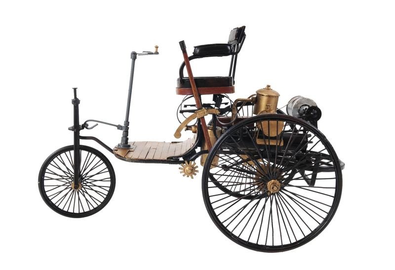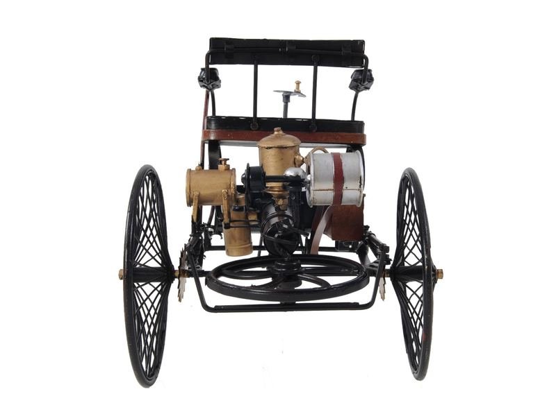 A must have for the collector and enthusiast, this c1886 Three Wheeled Mercedes Benz Motor Car Sculpture is 100% iron and has real rolling wheels. This unique vintage replica model is a piece of art that features authentic and intricate details inclduing iron parts such as spoke wheels, gold painted engine, unique steering wheel, and leather seats. There are detailed insignias and painted details that showcase the masterful craftsmanship of its creators. 8.8″ x 14″ x 8″