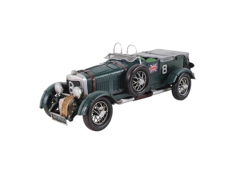 A must have for the collector and enthusiast, this c1930 Bently Blower British Race Car Model Sculpture is made iron and finished in antiqued green color and with a scale of 1:13 is designed to be an authentic looking replica.This unique vintage model is a piece of art that comes complete with unqique details like the supercharger sitting in the front of the car. A great accent for your car enthusiast! 5″ x 13.5″ x 5″