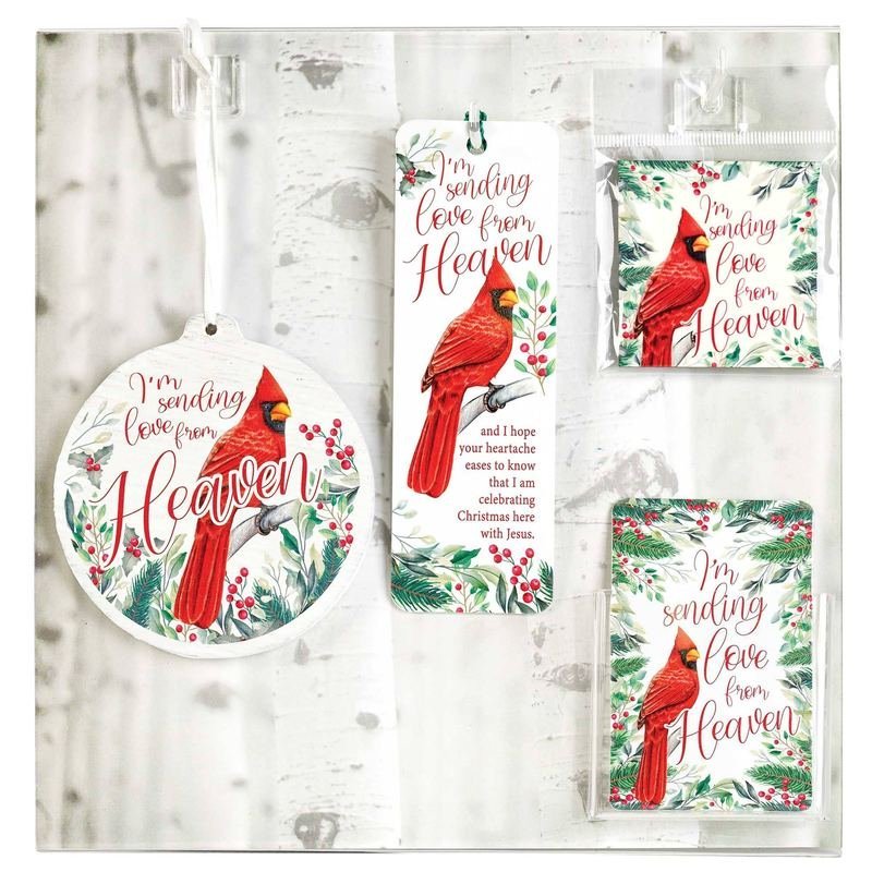 The Cardinal I’m Sending Love from Heaven Board and Assortment includes: 6 of CHOW-1029 ornaments, 8 CHMAGHB-1010 magnets, 24 CHBKMTL-1016 tassel bookmarks, 24 CHBKMPK-1016 pocket card bookmarks, and one 10″ x 10″ styrene display board with art insert, easel back and slatwall hook.Ingredients: Size: Color: Made In: United States