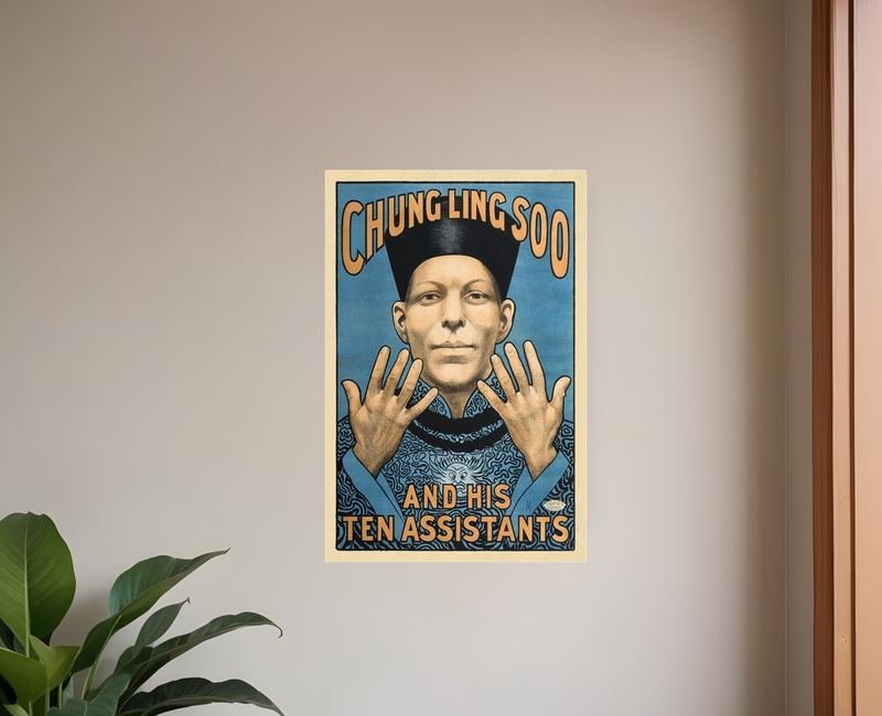 Add an air of fashion to your room and rejuvenate the space with this c1908 Chung Ling Soo vintage magic unframed print wall art. Unframed, this flat poster art has a fresh and distinct taste to grace your walls with style. Reproduced for you on paper, this hanging decorative accent features the famous magician with his 10 assistants that are actually his own fingers. Instantly liven up your space with this fun and mysterious art that brings color and dimension to your walls. 12 inches H x 9 inches W x 0.1 inches D
