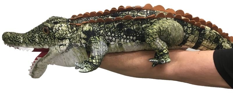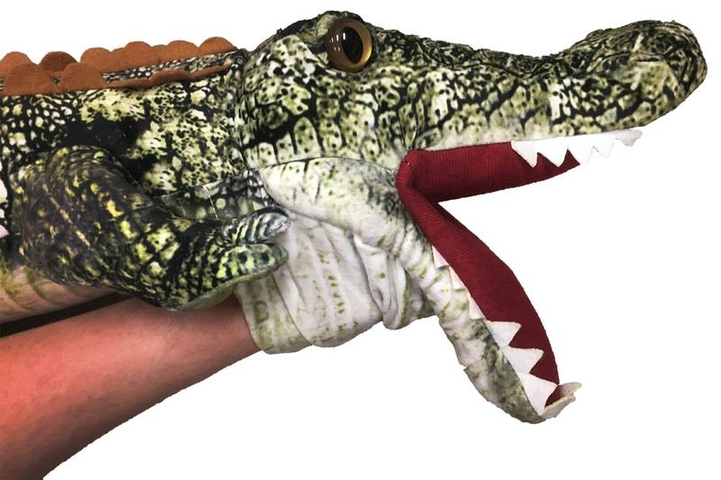 This large crocodile plush is also a puppet for small hands! The great stuffed beast is over 40 inches long and it has a playful puppet mouth made of sturdy felt.