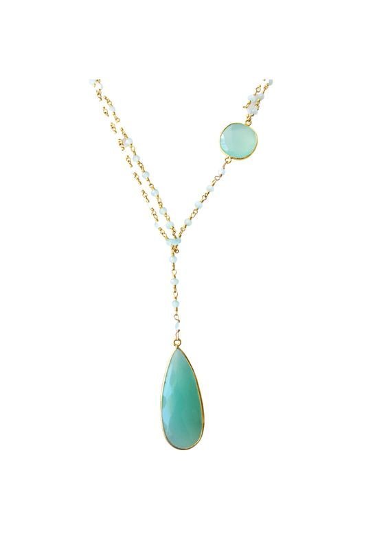 A gold and semi-precious chalcedony beaded chain necklace with a round semi-precious chalcedony stone set in an 18k gold vermeil bezel, cascading down to a teardrop-shaped semi-precious chalcedony stone pendant set in an 18k gold vermeil bezel.