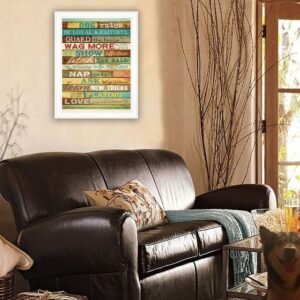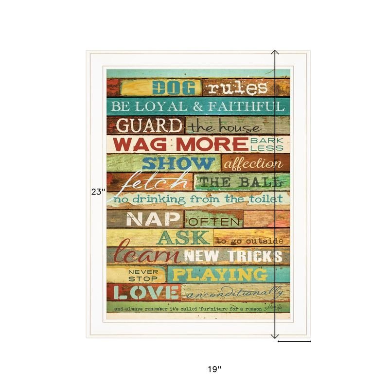 Add an air of fashion to your room and rejuvenate the space with this dog rules 5 white framed print wall art. This print is a visual artistic expression that allows you to decorate your space in style. Reproduced for you on paper, this hanging decorative accent will be a trendy and fashionable way to dress your walls. Hang on your wall to add some up to date fashion and decoration. Instantly liven up your space with this art that brings color and dimension to your walls. 23-inch H x 19-inch W x 1-inch D