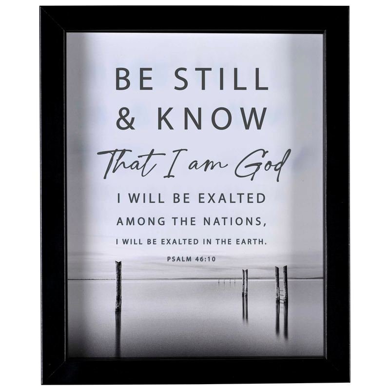 Shadow Box Style Framed Decor Features A Serene Water Scene With Psalm 46:10: Be Still And Know That I Am God; I Will Be Exalted Among The Nations, I Will Be Exalted In The Earth. Parts Of The Design Are Printed Directly On The Glass, While The Rest Are On An Insert, Giving The Piece A Dimensional Look. Frame Is MDF Wood With Black Finish. Print/Glass Size Is 8 X 10; Outer Frame Size Is 9 X 11 X 1-1/4. Has Both An Easel And Wall Hanger To Display Either Tabletop Or Wall.Ingredients: Size: Color: BLK/WHTMade In: United States
