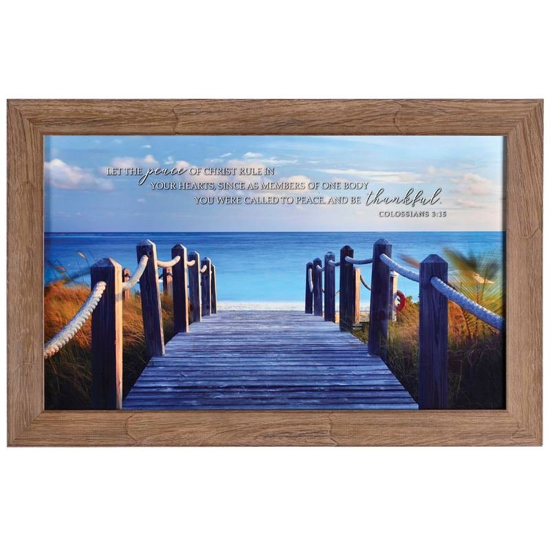 This Framed Wall Art Has A Beautiful Beach Boardwalk With Nautical Rope And Inspires A Peaceful Journey To Water With The Verse Colossians 3:15: Let The Peace Of Christ Rule In Your Hearts Since As Members Of One Body You Were Called To Peace, And Be Thankful. Picture Is Framed Under Glass; Owl Barnwood Finish Frame. Print And Glass Size Is 25 x 15; Outer Frame Size Is 28 5/8 x 18 5/8. Wire Hanger On Back. Art By Dennis Frates Copyright Sagebrush Fine Art 2022Ingredients: Color: Size: QTY: 1.0