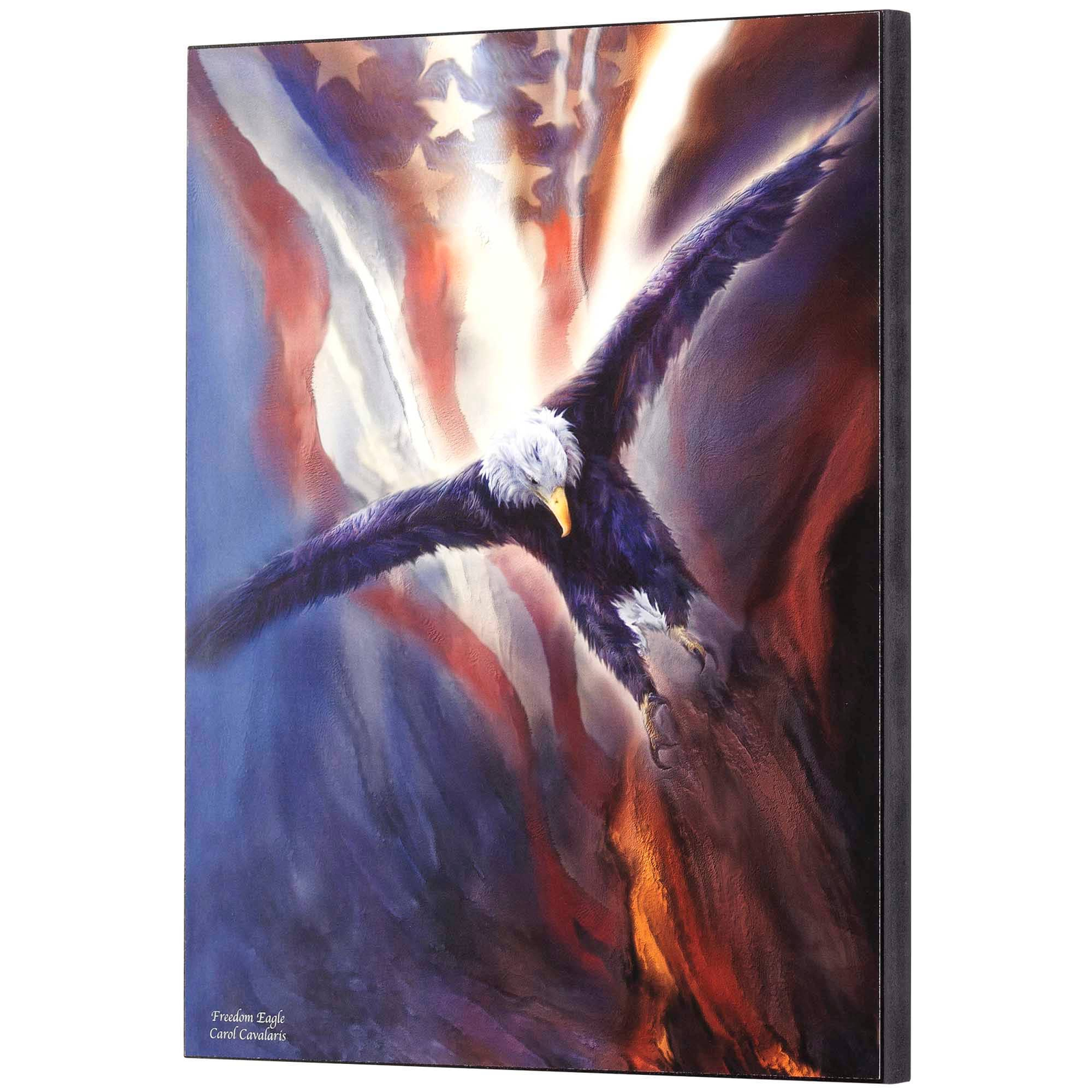 This vivid, patriotic scene incorporates a perching eagle with an American flag and bright rays of light.