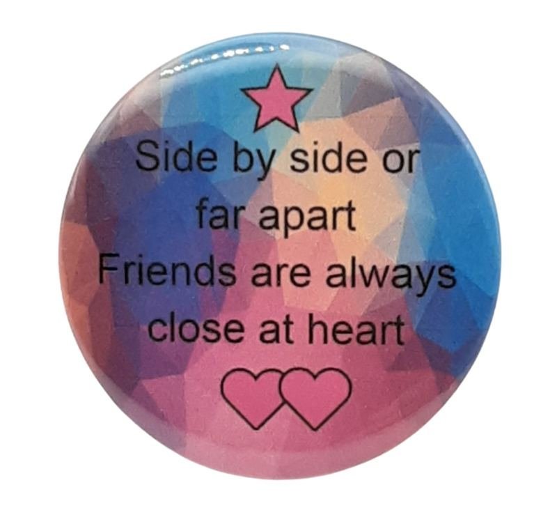 Friends Close at Heart: A unique and stylish 2.25-inch pinback button, perfect for adding a touch of personality to your attire or accessories. Features a high-quality design and durable materials for long-lasting use. Ideal for collectors and enthusiasts.Ingredients: Size: 2.25 inchColor: Made In: United States