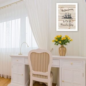 Add an air of fashion to your room and rejuvenate the space with this friendship journey 3 white framed print wall art. This transportation inspired wall art features a ship icon and will bring a refreshing look and perspective to your walls. This print is a visual artistic expression that allows you to decorate your space in style. Reproduced for you on paper, this hanging decorative accent will be a trendy and fashionable way to dress your walls. Adding this hanging wall art to your space to make your room feel more finished and attractive. Instantly liven up your space with this art that brings color and dimension to your walls. 14-inch H x 10-inch W x 1-inch DIngredients: Size: Color: Made In: United States