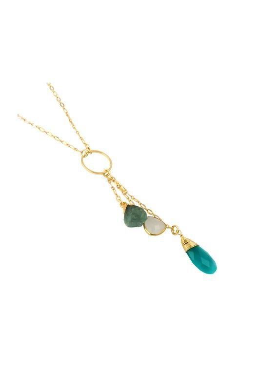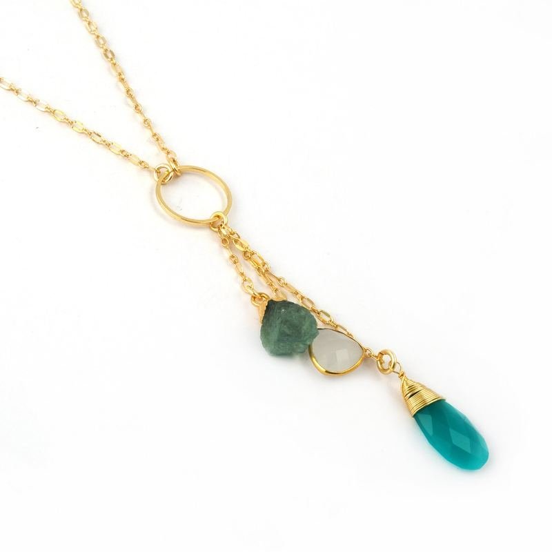 Hand wrapped chalcedony, gold plated moonstone and raw aquamarine drop necklace in vermeil.