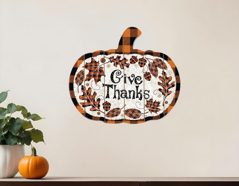 This give thanks unframed print wall art will add a beautiful decorative accent to your decor. This unique and novel shaped art will bring some dimension and artistic design to your wall. This print is a visual artistic expression that allows you to decorate your space in style. Reproduced for you on wood, this hanging decorative accent will be a trendy and fashionable way to dress your walls in a rustic and modern farmhouse vibe. Adding this hanging wall art to your space to make your room feel more finished and attractive. Utilize this opportunity to create a focal point in the room with this fabulous wall decor option. 15-inch H x 17.25-inch W x 1-inch D