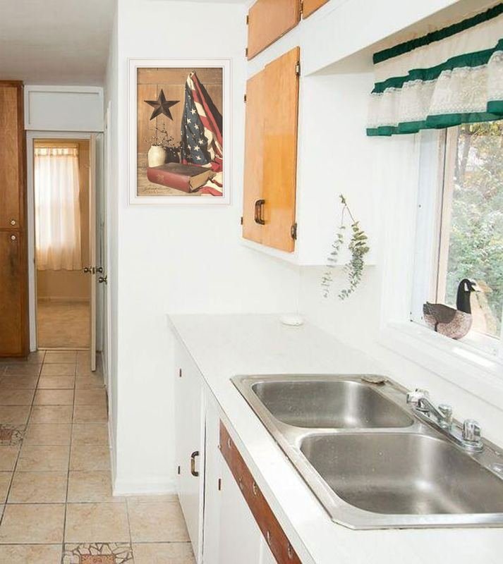 Unique and decorative, this god and country 4 white framed print wall art will leave a lasting impression. This print is a visual artistic expression that allows you to decorate your space in style. Reproduced for you on paper, this hanging decorative accent will be a trendy and fashionable way to dress your walls. Hang on your wall to add some up to date fashion and decoration. Utilize this opportunity to create a focal point in the room with this fabulous wall decor option. 21-inch H x 15-inch W x 1-inch D