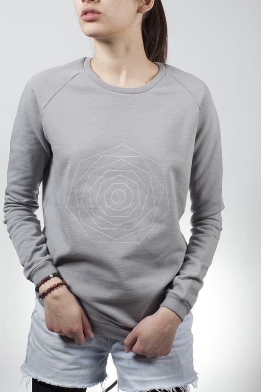 This sweatshirt features our elegant signature “septagon” flower in light gray on the front.