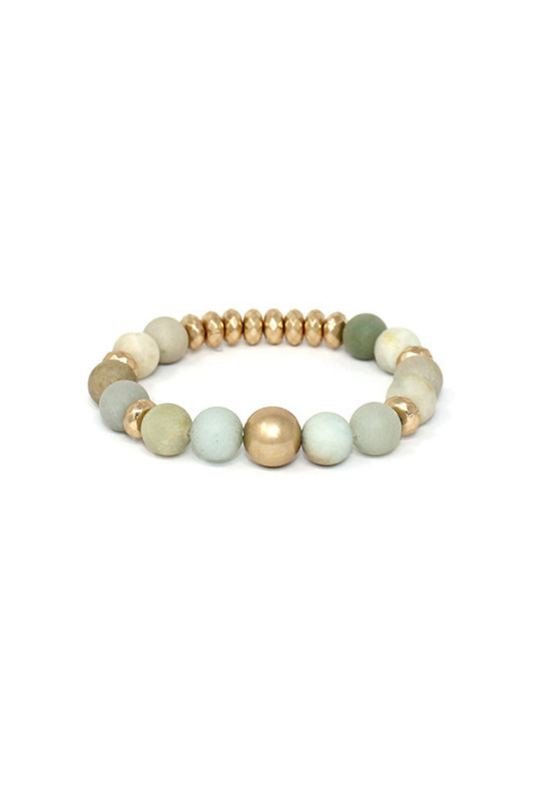 A stretch bracelet with green and blue soapstone and gold beads.