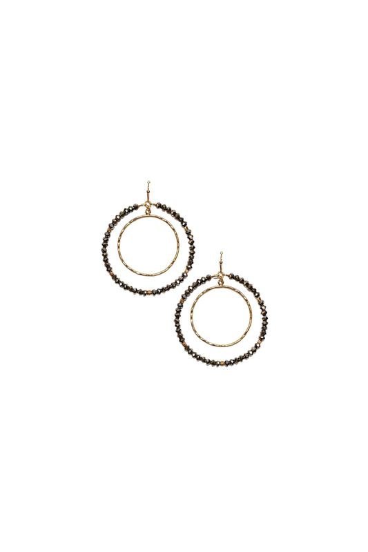 Gold dangle earring with double hoop drop with one hoop set inside the other. The outer hoop is beaded in grey crystal with gold accent beads, while the interior hoop is hammered gold.