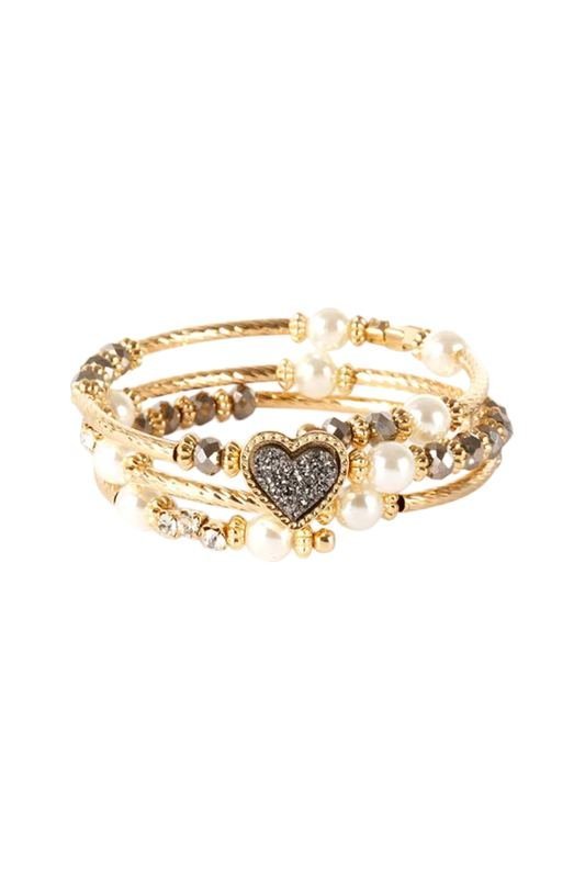 Grey Heart Druzy and Pearl Coil Bracelet
