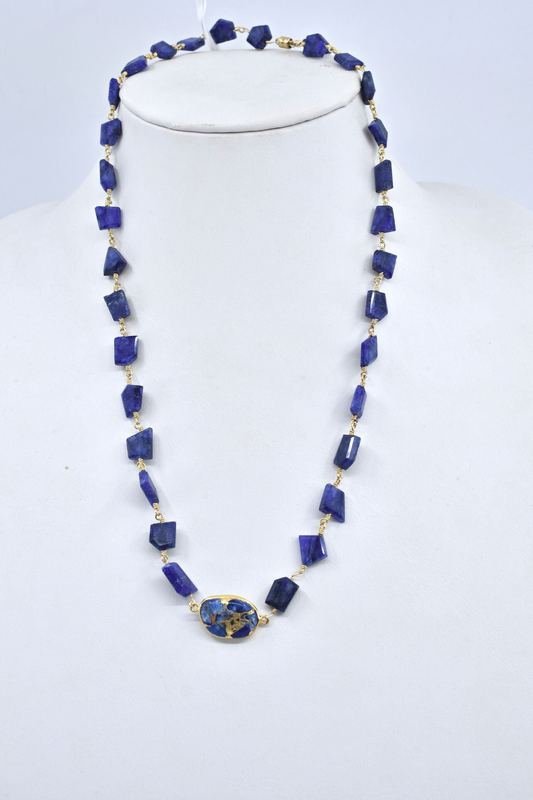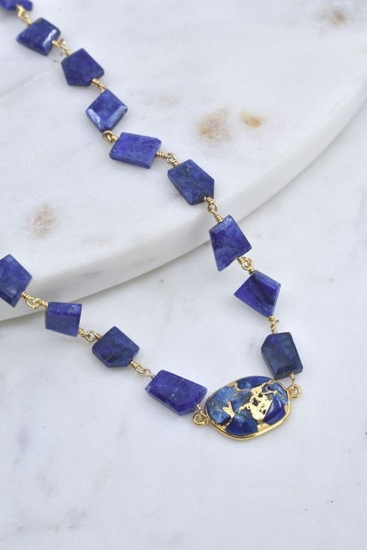 A blue mojave copper turquoise pendant is set in a 14k gold bezel on a vermeil and sapphire stone chain with magnetic clasp closure.