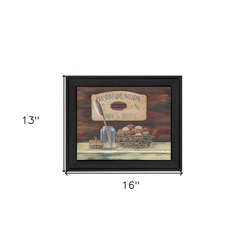 Add an air of fashion to your room and rejuvenate the space with this handmade soaps 1 black framed print bathroom wall art. This print is a visual artistic expression that allows you to decorate your space in style. Reproduced for you on paper, this hanging decorative accent will be a trendy and fashionable way to dress your walls. Hang on your wall to add some up to date fashion and decoration. Utilize this opportunity to create a focal point in the room with this fabulous wall decor option. 16-inch H x 13-inch W x 1-inch D