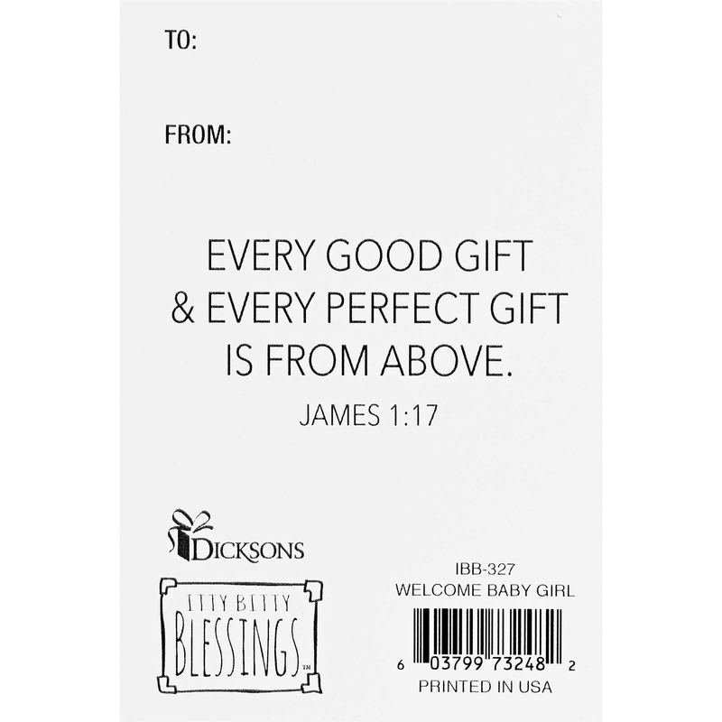 Itty Bitty Blessings (Tm) Cards Come In A Pack Of 24. Front Of This Card Features A New Baby Girl Theme With Text: Welcome Baby. The White Back Displays James 1:17: Every Good Gift And Every Perfect Gift Is From Above – Also On The White Back Are To And From Spaces For Personalization. Made In USA. Size 2X3. Packed In A Polybag.