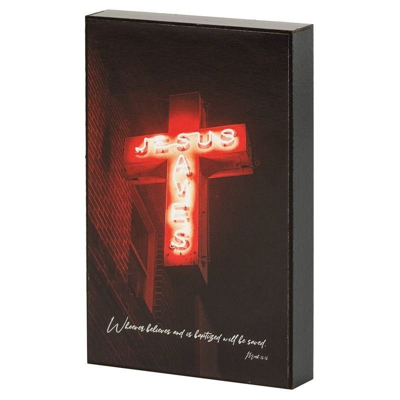 Lighted with the words Jesus Saves, the cross in this image makes a beautiful accompaniment to Mark 16:16, “Whoever believes and is baptized will be saved.” Plaque is 4″ x 6″ x 3/4″; it can sit on a tabletop, or hang on a wall using the slot in back.
