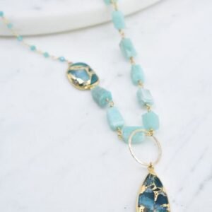 Ingredients: Size: 38″ Length, 2″ DropColor: Teal Mojave Copper TurquoiseMade In: United States