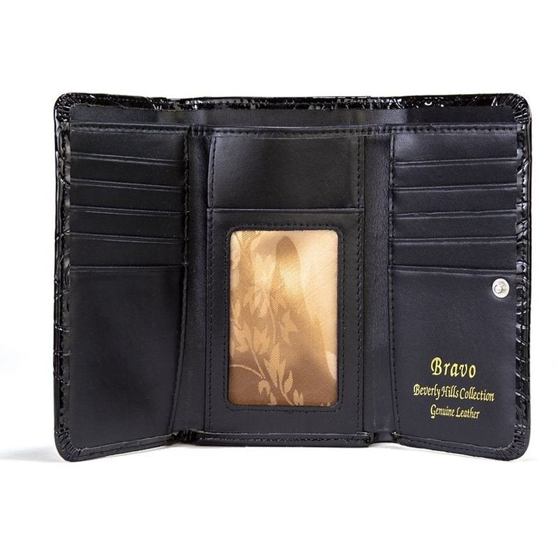 Enamel Coated Italian Calfskin Leather. Gold Leaf Embroidered Cotton Polyester Twill Lining. Front Opening: 4 credit card slots, zippered coin/notes compartment, 2 id clear pocket, 3 bills/notes holder compartment & adjustable clips. Center Opening: zippered compartment contains 2 bills/notes compartments. Back Opening: 14 credit card slots, 1 bills/notes compartment & 1 pen/lipstick holder Made in USA.All Bravo Bags/Wallets are coated with airplane paint a exclusive technology to Bravo to prevent scratches, cracking, peeling and are RFID proof.