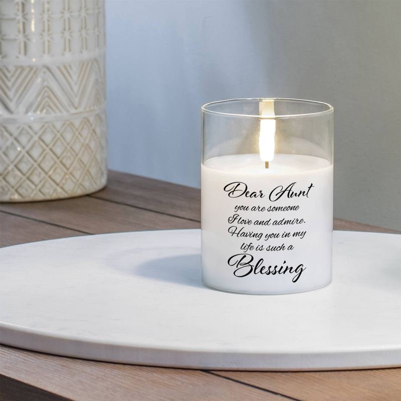 Flameless clear LED glass candle that says: Dear Aunt-you are someone I love and admire.