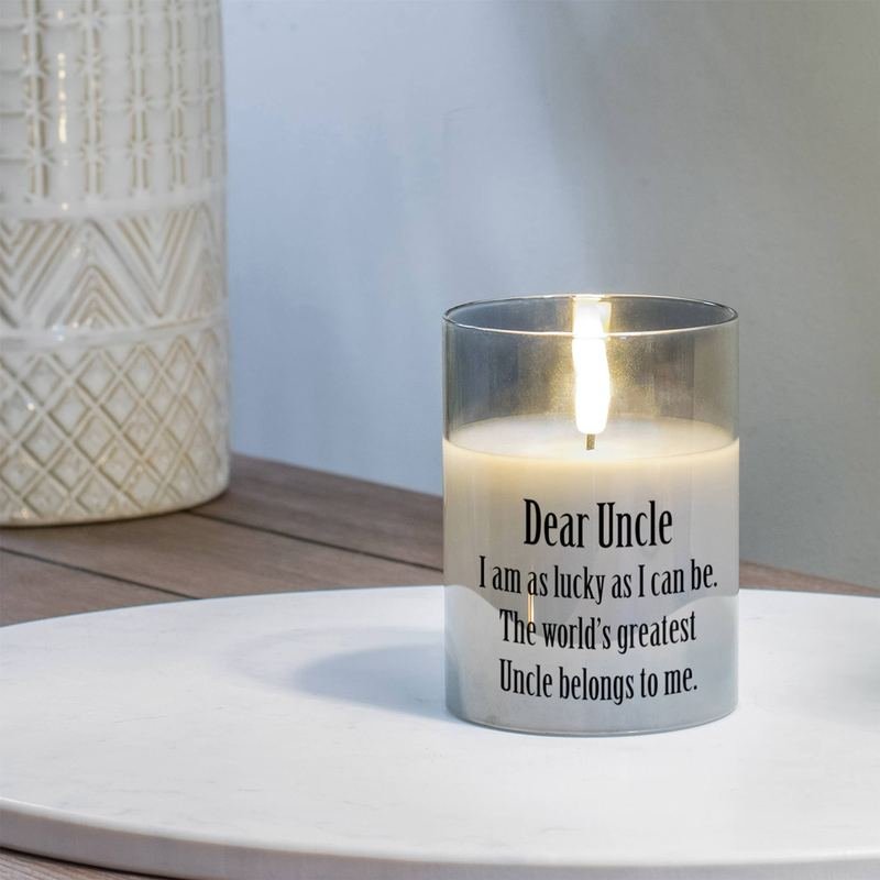 Flameless pearlized grey LED glass candle that says: Dear Uncle/I am as lucky as I can be.