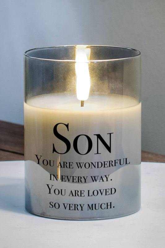 Flameless pearlized grey LED glass candle that says: Son/You are wonderful in every way.
