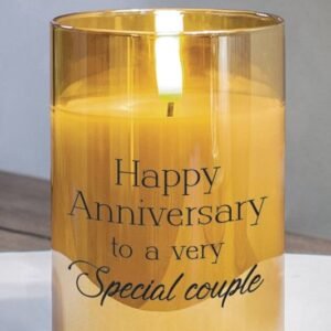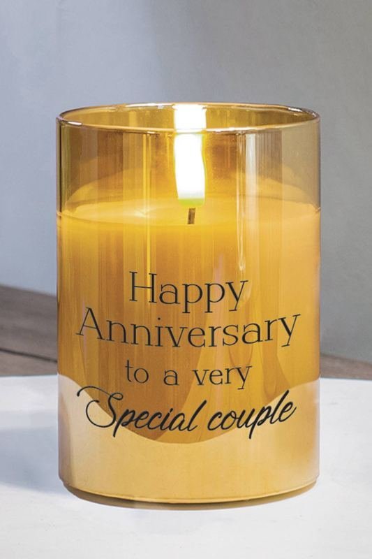 Flameless pearlized gold LED glass candle that says: Happy Anniversary to a special couple.