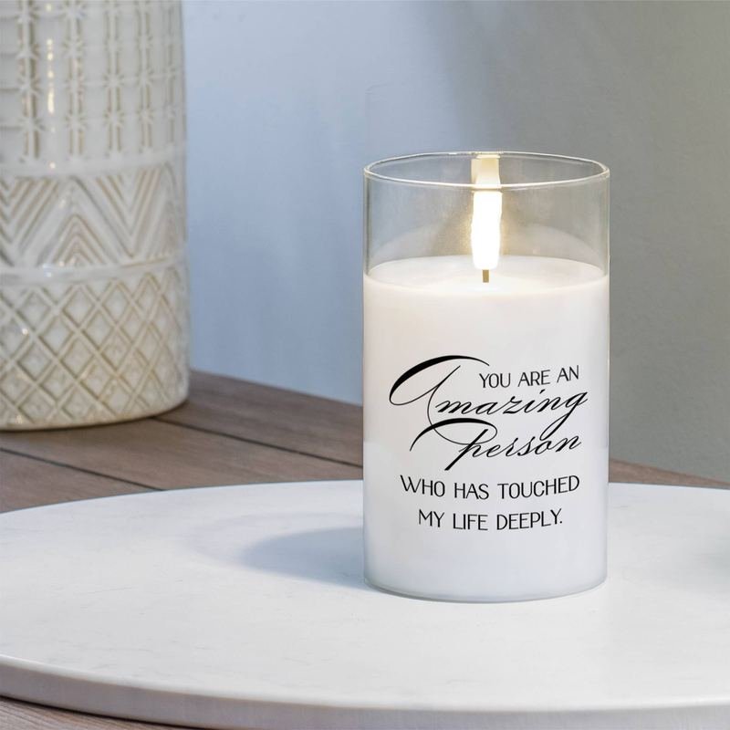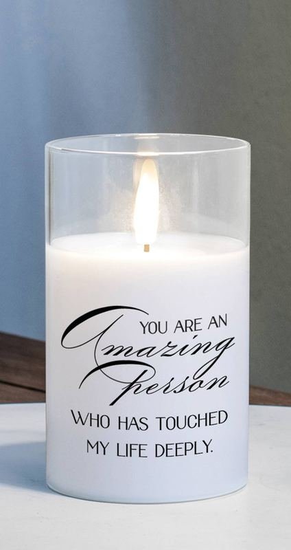 Flameless clear LED glass candle that says: You are an amazing person who has touched my life deeply.
